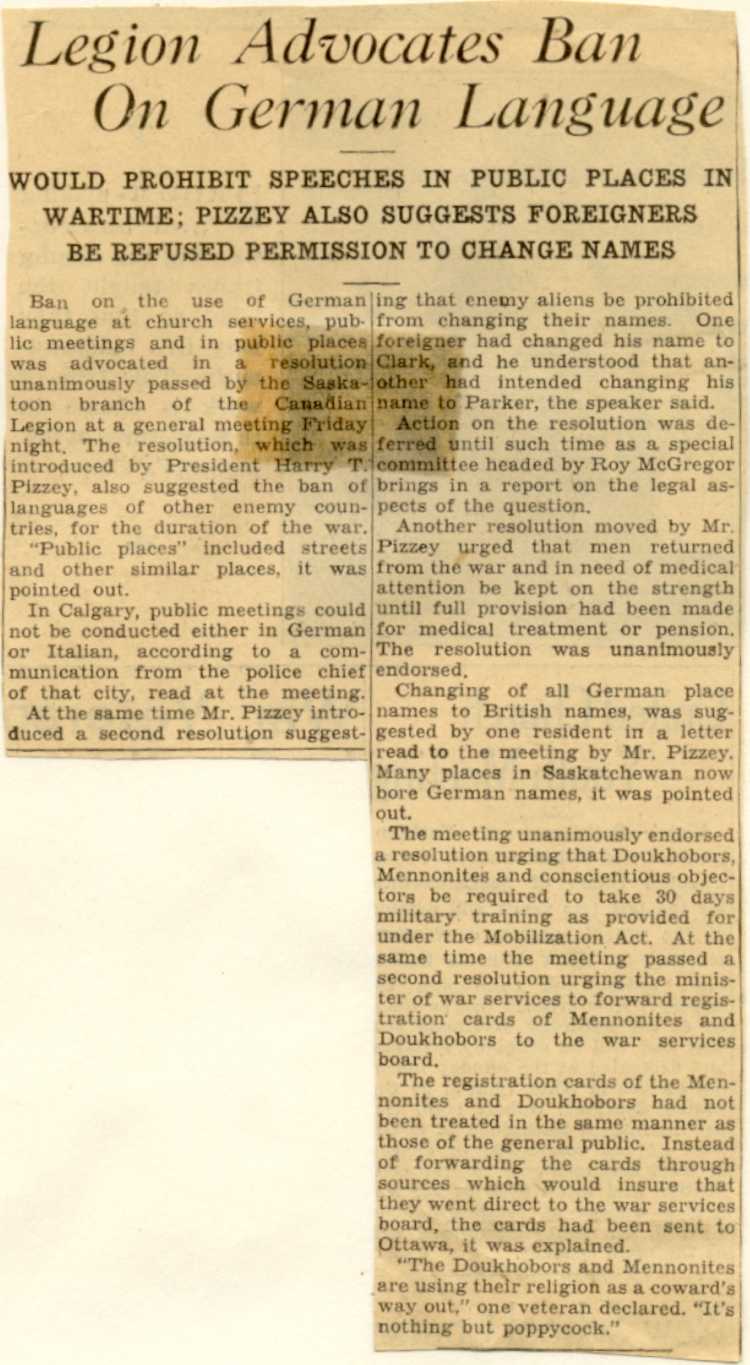 Canadian Legion Advocates Ban on German Language.