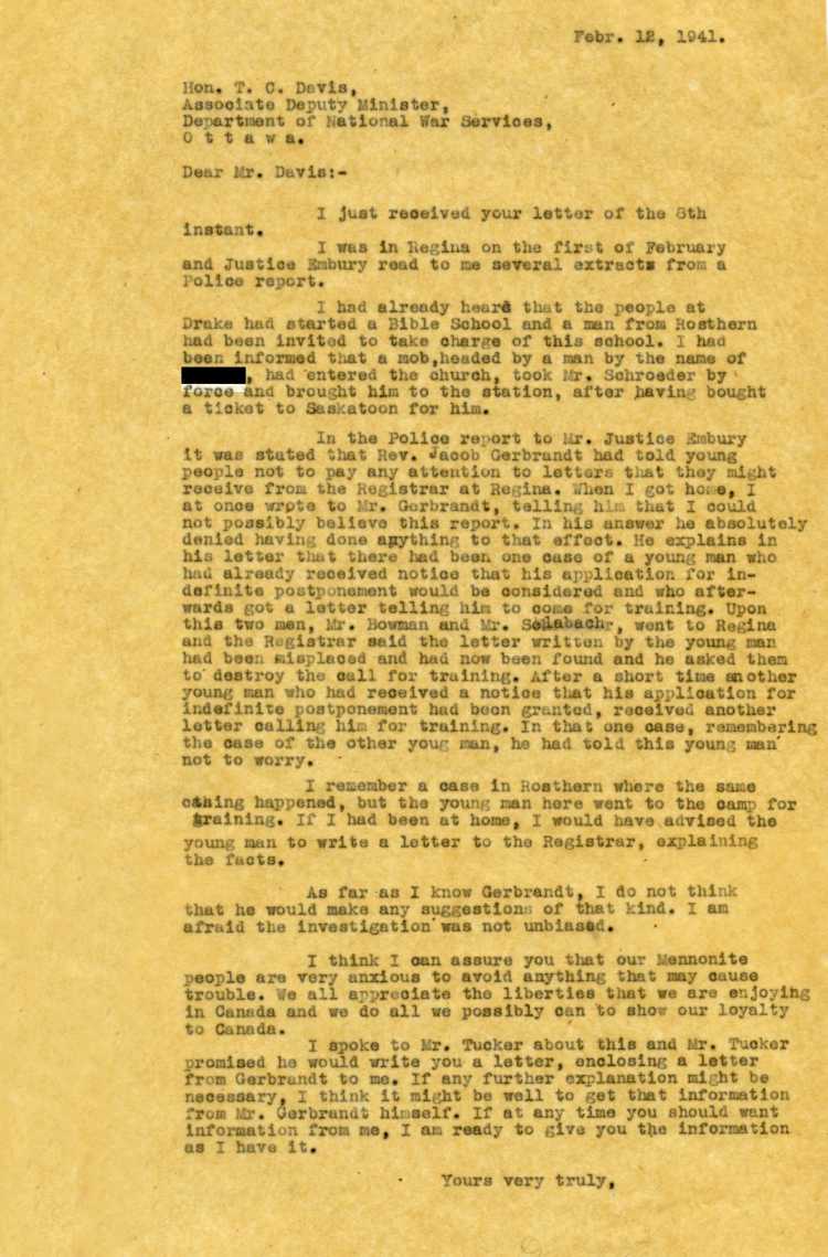 Response to T.C. Davis from David Toews, February 12, 1941.